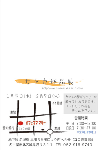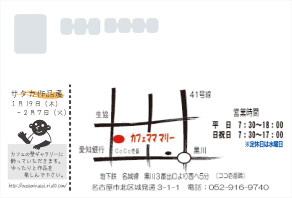 [個展]サタカ作品展 創作活動 2012年02月07日 名古屋の黒川で個展やります![ サタカ作品展 ]場所:カフェ マママリー期間:1月19日(木)〜2月7日(火)時間:平日 7:30〜18:00 日祝日 7:30〜17:00 ※水曜日は定休日です。美味しいご飯とコーヒーでリラックスして作品を見てもらいたいです^^!カフェの壁ギャラリーに飾っていただきます!嬉しい事に期間中、カラーセラピーの素敵助っ人も来てくれます〜1/22、2/4にカラーセラピーやります、予約枠は既に埋まっていますので、興味ある方にはまた別の機会で!その日は見学に来るも良し、サタカは必ず在廊してますので、良かったらお喋りにでも来て下さいね◎地下鉄 名城線 黒川駅3番出口より西へ5分(ブックオフの方向です)〒461-0046 名古屋市北区城見通3-1-1Tel.052-916-9740マママリーHP | ブログ DM表の横版DM表の縦版 イラスト一覧へ戻るPR