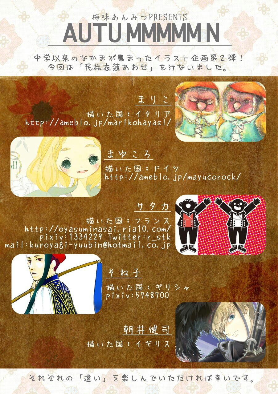関西コミティア43 創作活動 2013年10月13日 無事終了しました!!ありがとうございました!----「 関西コミティア 」に参加します!※ 助川のPNが旧式です。申し訳ないです。日時:2013.10.13(日) 11:00〜15:30 まで場所:OMMビル(大阪マーチャンダイズ・マート)2階A・B・Cホール 会場までのアクセスはコチラを参考にしてください。スペース:L-43サークル:梅あんまりこ、助川亜井佳(ex.朝井健司)と合同で参加です。サタカは、ペラッペラのイラスト本を出します。梅味あんみつのメンバーで ” 民族衣装 ” をテーマに各自に国をわりふり、ポストカードセット作りました^^!まりこ、そねこ、まゆころ、助川亜井佳、サタカの5人合同 イラスト一覧へ戻るPR