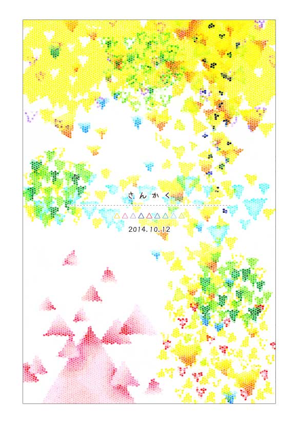 さんかく(イラスト本) 創作活動 2014年10月09日 タイトル「さんかく」イラスト本 18ページ(フルカラー):価格300円発行は、2014.10.12「さんかく」を、沢山描きました。同じ三角が沢山あっても、違う絵になりました^^。イラストと、ちょっとしたキャプション付きです。前に、私の絵は、タイトルとキャプション(文字)が付いている方が、分かりやすいと言われたので、見開き、右に言葉、左にイラストと、なっております。裏表紙は、全ての三角を並べてみました。 カラフルで可愛い感じになりました。言葉も全て、三文字の「〜う」っと、なってます。色と言葉を楽しんで下さい◎ イラスト一覧へ戻るPR