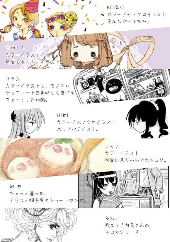 梅あん-冬本 創作活動 2015年02月20日 タイトル「Assorted Chocolate」28ページ(表紙カラー/本文カラーとモノクロ)発行は、2015.02.01チョコレートをテーマにイラストやマンガ。それぞれの味をお楽しみください。 メンバーは、pixiv / まゆころMitsukikRumipixiv / まりこ(HP)pixiv / サタカ(HP)pixiv / 朝井健司pixiv / そねこ イラスト一覧へ戻るPR