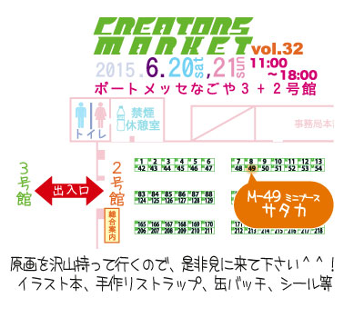 クリエーターズマーケット vol.32 創作活動 2015年06月21日 無事終了しました!足を止めて下さった方、名刺をもらって下さった方、ありがとうございました。今回、ライブペイントをしていて、沢山の方に、ペンでイラストを描いていると、見てもらえて良かったです。次も頑張ります^^!作品の横に、細々と、ライブペイントしてました。全部で、143人と、8匹描き上げました! ---------「クリエーターズマーケット vol.32」に、参加します。内 容:中部地区最大級のつくる人の祭典(アート、デザイン、手作り、ギャラリー、マーケット)開催日:2015年 06月20日(土)、21日(日) 11:00〜18:00会 場:ポートメッセ名古屋 2号館/3号館ブース:2号館ミニブース M-49参加名:サタカ イラスト一覧へ戻るPR