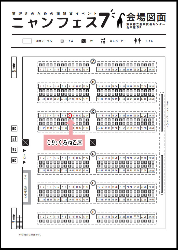ニャンフェス7 創作活動 2018年04月08日 「 ニャンフェス 7 」に参加します!* スペースは、くろねこ屋さんの所に、猫のミニイラストを数点置いてもらう予定です。 *日付:2018年 4月8日(日)時間:11:00〜16:00 ※会場:東京都立産業貿易センター台東館 5Fスペース:C-9出展名:くろねこ屋 ※ ニャンフェスの入場の際、入場券(前売/当日 500円)の購入が必要になります。 11時~13時の入場の方は、事前に前売り券を購入してください。 当日券の方は、13時ごろからしか入場できません。くろねこ屋さん:ツイッター イラスト一覧へ戻るPR