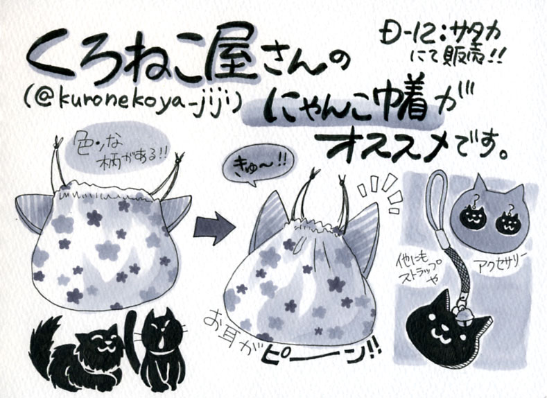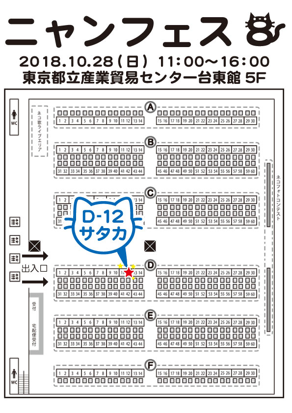 ニャンフェス8 創作活動 2018年10月28日 「 ニャンフェス 8 」に参加します! 日付:2018年 10月28日(日)時間:11:00〜16:00 ※会場:東京都立産業貿易センター台東館 5Fスペース:D-12出展名:サタカミニイラストと、イラスト本など持って行きます♪ ☆ くろねこ屋さんと、一緒に参加します♪ ☆ ※ ニャンフェスの入場の際、入場券(前売/当日 500円)の購入が必要になります。 11時~13時の入場の方は、事前に前売り券を購入してください。 当日券の方は、13時ごろからしか入場できません。くろねこ屋さん:ツイッター イラスト一覧へ戻るPR